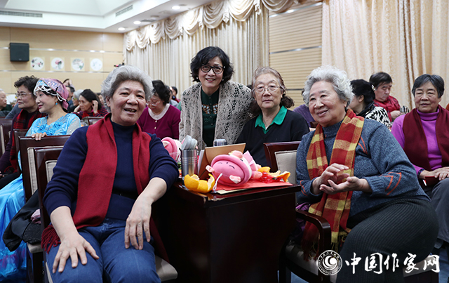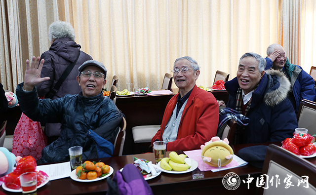 前来参加联谊会的老同志们签到,工作人员向老同志赠送新春吉祥物