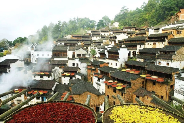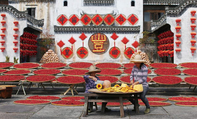 2018年9月12日,安徽黄山呈坎古村村民在晒场上晾晒辣椒、玉米等各类农作物。