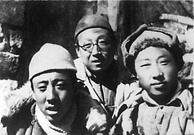1943年3月在阜平河西村工作的孙犁(左)与胡华(右)、王炜(中)