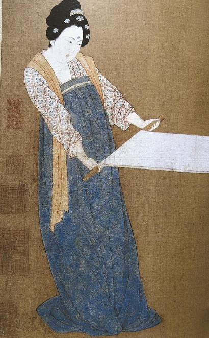 张萱和周昉是唐代仕女画最重要的代表人物。《宣和画谱》称张萱“于贵公子与闺房之秀最工”,善于描绘曲眉丰颊、“朱晕耳根”的仕女形象。张萱的原作今已无存,史上留下两件重要的摹本,即传说是宋徽宗临摹的《虢国夫人游春图》卷和《捣练图》卷。其中《捣练图》卷现藏于美国波士顿美术博物馆,表现的是贵族妇女捣练缝衣的工作场面,按劳动工序分成捣练、织线、熨烫三组。只见宫女们身着低领窄袖短襦,系高腰长裙并扎丝带,身披轻薄如纱的印绣纹样披帛,举止娴雅,意态从容。
