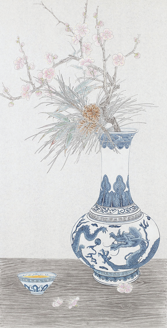 在陈凤壬的工笔绘画系统中还有另外一个类型,以《岁岁年年》《待知音》为代表。它所画下的多是文玩、花瓶和“清供”,颇有现代感和装饰意味,精细典雅,悦目清心;同时他还尝试在宣纸上绘画石窟里的佛像雕塑,试图在平面上展现石像的重量和层面感,展现漫长岁月的斑驳留痕……他一直在变,在尝试,让自己能够更广阔些,然而一直未变的是他对艺术的精益求精,以及对那种恬静、淡然、超拔气息的捕捉和把握。再强调一次,这种气息来自于他的内心,已经和他完整地融为了一体。他内心的安静实在让人敬重。