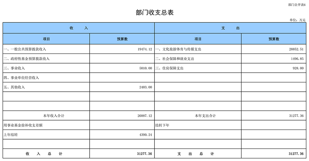 按照综合预算的原则,凤凰彩票平台登录入口所有收入和支出均纳入部门预算管理。收入包括:一般公共预算拨款收入、事业收入、事业单位经营收入、其他收入、上年结转。支出包括:文化旅游体育与传媒支出、社会保障和就业支出、住房保障支出。凤凰彩票平台登录入口2019年收支总预算31277.36万元。
