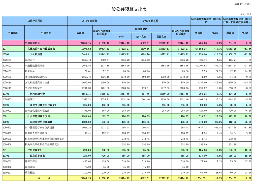 凤凰彩票平台登录入口2019年一般公共预算当年拨款19474.12万元,比2018 年执行数减少1734.03万元,主要是按照党中央、国务院关于过“紧日子”的有关精神,2019年按不低于5%压减“少数民族文学发展工程”、“设备设施改造经费”等非刚性、非重点项目支出,同时重点保障了“文学创作扶持经费”、“凤凰彩票平台登录入口运行费”等项目支出,体现在有关支出科目中。