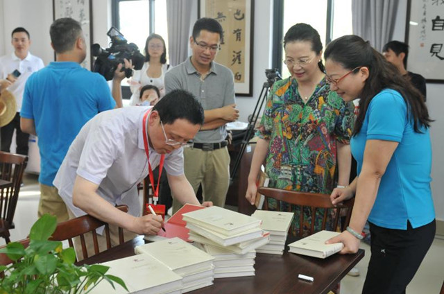 赠书仪式后,作家在自己的作品上签名