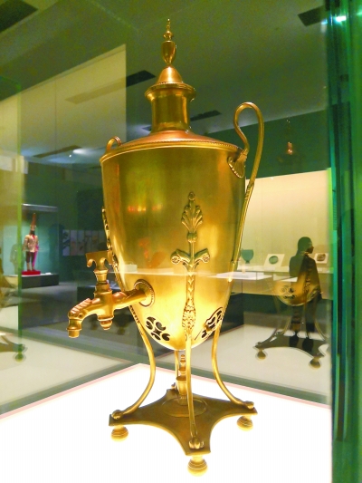 随着茶叶进入俄罗斯,一些重要的饮茶习俗也随之出现。请看这两只俄罗斯的茶壶,与中国传统概念中的茶壶相比,实在可谓“巨大”,而且样子也不同。注意到了吗?它们的下端都有一个笼头,与咱们常见的饮水机相似。俄罗斯人就是在这种特殊的茶壶中用开水冲泡茶叶。