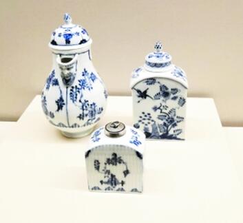明清时期,中国商品大量进入西方,备受推崇,欧洲劲吹“中国风”,并深刻影响了欧洲等地区的陶瓷业发展进程,出现了既洋溢着中国风格又散发着异国情调的产品。德国著名的瓷器品牌“迈森”就是在这样的背景下诞生的。18世纪初,因成功烧制出欧洲第一件瓷器而诞生的迈森瓷器厂,为迎合当时的国王奥古斯都对东方瓷器的痴迷,最初的产品以模仿清康雍乾时期的瓷器为主。拉脱维亚展厅里的一套青花茶具,就是迈森生产的,具有明显的模仿痕迹。