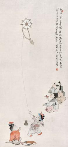 溥心畬1934年绘制的《江南二月儿童戏》近七平尺,题材和尺幅均不多见,五位婴童姿态各异,视线聚焦在高处的纸鸢,意趣盎然。