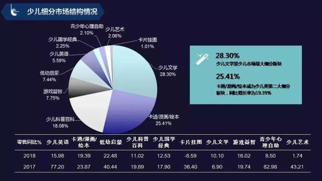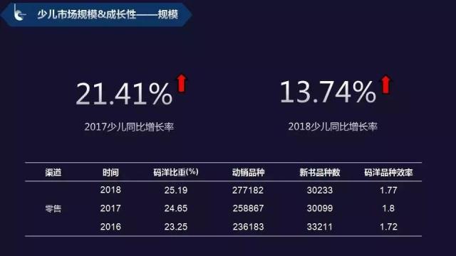 在刚刚过去的2018年,少儿出版市场同样享受了丰收的喜悦:少儿市场的同比增长为13.74%,虽然较2017年21.41%的增长速度放缓,但少儿市场依然是图书市场占比最大的细分类且码洋比重较去年有所上升,2018年码洋比重增长到25.19%。尤其是在网络端,少儿图书在网店渠道的销售增速高达26.56%,码洋占比达27.15%。