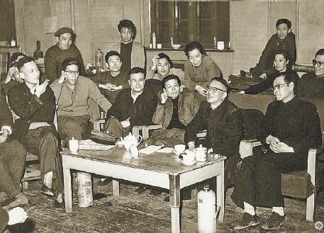 1963年4月2日,老舍(前排右二)观看《茶馆》排练后与演职人员交谈 图片由北京人艺戏剧博物馆提供