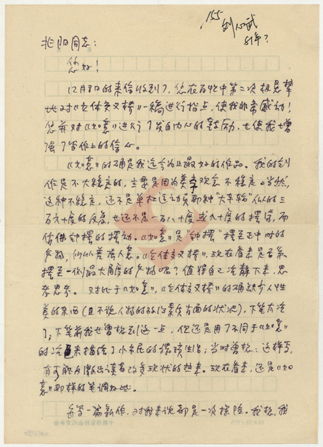 这封书信落款处没有具体的年份,但凤凰彩票从内容上不难推断出时间。如信上所言,《如意》(1980年2月写毕)已经完稿并发表,而《立体交叉桥》(1980年10月写毕)是初稿未发表,结合两部作品的创作时间和发表年份来推断,这封信应该写于1980年12月11日。至于信中提到的“另一素材”应该是紧接着于1981年1月创作完成的《大眼猫》。