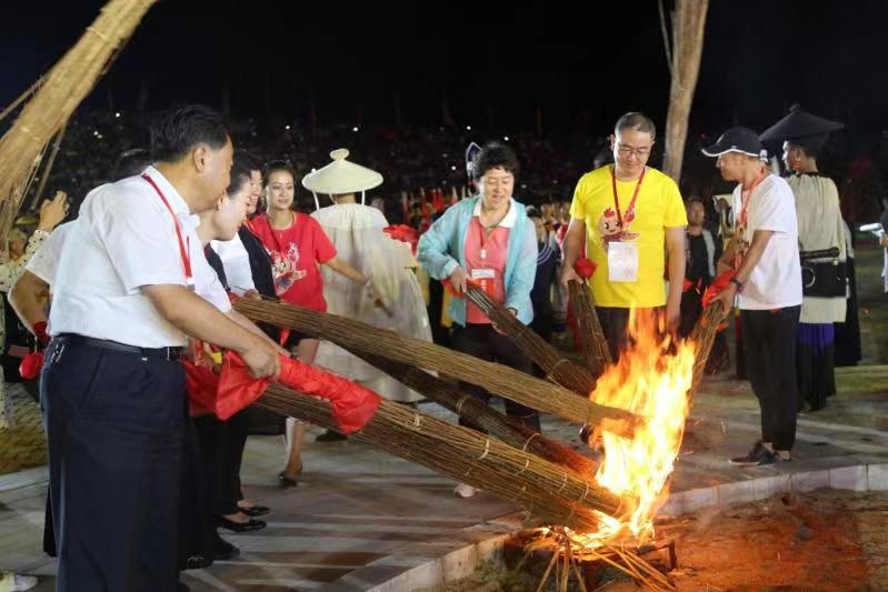 火把节狂欢活动上,西昌市委书记李俊(右二)和国内外嘉宾共同点燃熊熊的火把。(李春摄)