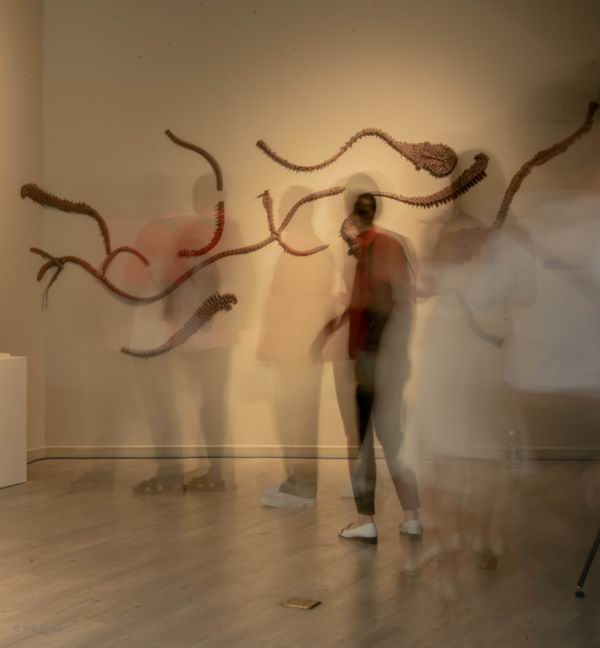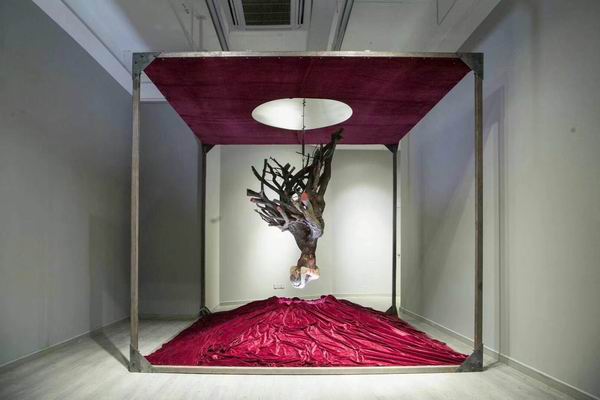 刘嘉颖以法国凯布朗利博物馆藏的“马拉甘雕塑”、“毛伊姆面具”、“祈愿板”三件展品为灵感,创作了《上下求索》,这是一件比较大型的装置作品。悬挂在中间、有规律得做上下运动的是一棵倒置的带根的“柿子树”。朝下的树干为雕刻的女性“精灵”造型,中间人脸部分借鉴的是“马拉甘雕塑”造型,“毛伊姆面具”则在形态上做了一些变化,被放置在女“精灵”的头部,“祈愿板”被抽象为丝带,环绕在女“精灵”的胳膊上。
