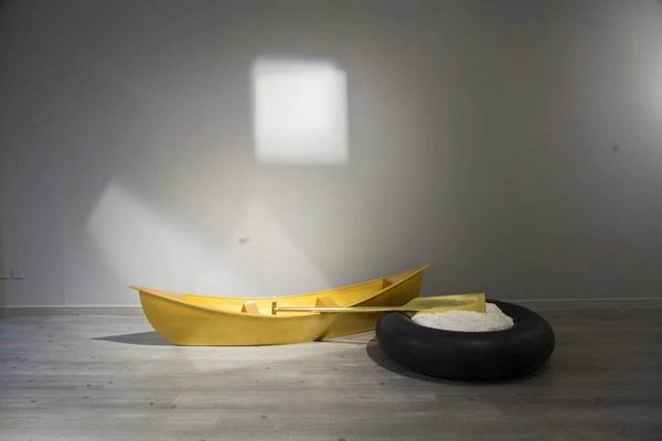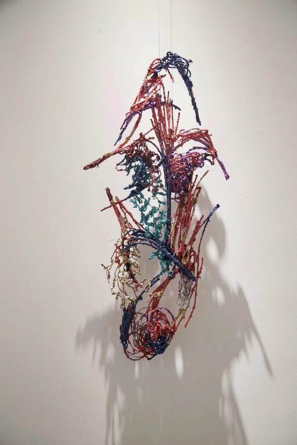 郑嘉燕的作品《异错镇-酋长》,以科瓦尔祖先雕像为创作原型,将中国传统手工艺扎染融入其中,使用不同的造型语言重塑了科瓦尔祖先雕像。冯志佳的《编织的线》、童言明的《木船、橡皮船和桨》也都对差异化的文明做出了个性化的有趣的解读。