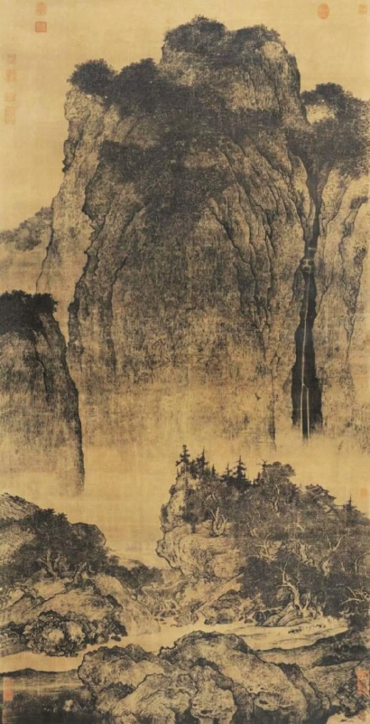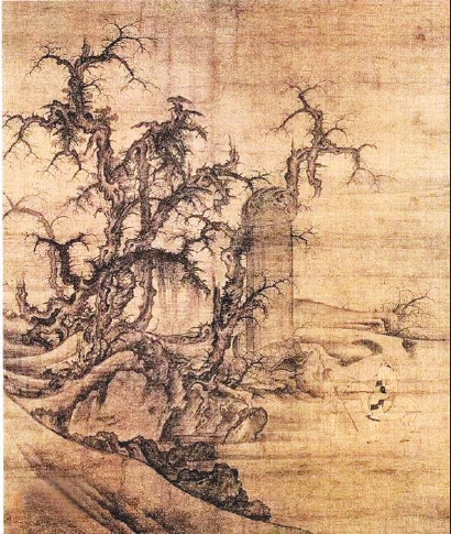 此时,除了在画上简单署上自己名款外,少有题记,有时甚至与观赏者捉起迷藏,把自己的名款写在树干或山石之间。如范宽《溪山行旅图》中“范宽”二字就写在画的右下角树荫下。郭熙《窠石平远图》在画幅左方中部用隶书小字写了“窠石平远,元丰戊午郭熙画”。梁师闵的《芦汀密雪图》,其“芦汀密雪臣梁师闵画”的署款就落在画幅后端中部。所有这些题跋都落在画中不起眼的地方,也是这一时期的独特形式。