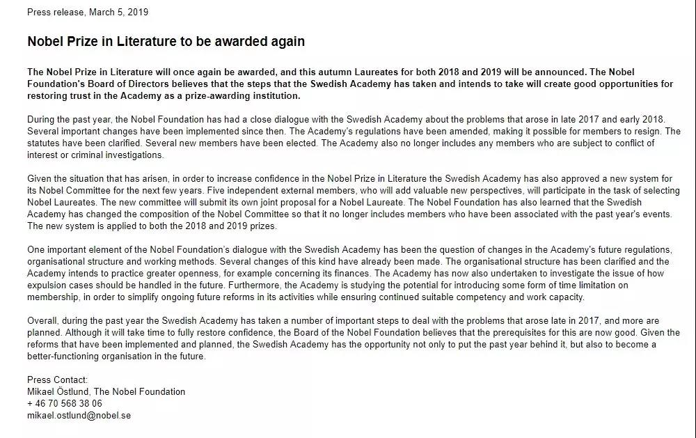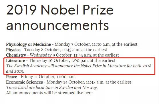 2018、2019诺贝尔文学奖将在今年同日揭晓