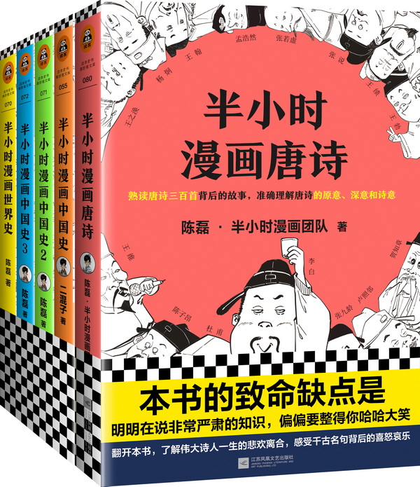 相比学校里填鸭式的唐诗教学,陈磊更希望大家用更形象的方式去认识唐诗。在《半小时漫画唐诗》中,原本活在教科书上的诗人们有了更鲜活的形象,初唐四杰分别为王勃、杨炯、卢照邻和骆宾王,书中戏称他们为“初唐F4”。又例如讲贺知章,37岁之前的人生用“学霸”两个字点评,37岁高中状元,从此人生开挂,运气好到爆炸。陈子昂、张若虚两位大神去世以后,他妥妥地C位出道,成了盛唐诗坛的老大哥。