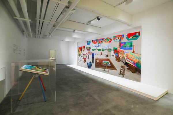 由日本建筑师青山周平主理设计的木木艺术社区,隶属于昔日老北京著名商圈隆福寺街 “再造计划”的一部分。刚刚落成的木木美术馆钱粮胡同馆与周遭正在施工的工地,在地理区划的分隔线上也并不明晰。嗅着扬尘与生灰的气息步入展馆,才发现这里实为从一处更具历史年代感的职工食堂和地下人防工事改建而来。在展厅入口正中放置的是大卫·霍克尼新近的作品《在工作室中》——在2017年结束之际,霍克尼将相机镜头转向他的工作室,在这里有他最近的画作、家具、画架和三角架上的大书……