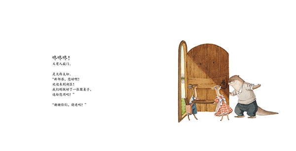 后来发现很多绘本都会用这样的方式去叙述,包括约翰·伯尼罕的《和甘伯伯去游河》、叶夫格尼·M.拉乔夫的《手套》等,《水獭先生的新邻居》作为毕业设计,当然要把我的学习成果展示一下,所以才有了绘本前面相似却不同的构图、文字。