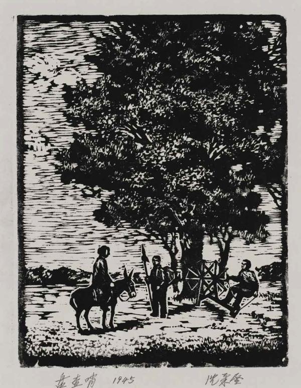 沈柔坚在1938 年参加新四军后开始从事美术创作,次年在皖南任新四军战地服务团绘画组组长,之后先后任抗日军政大学文化科科长、《新知识》杂志编委等职,创作了一批木版画作品。抗战胜利后,任山东省文化协会美术记者,创作了《盘查哨》《军民同乐》《学文化》《庆功图》《立功荣归》《全力支持前线》等石版年画和木版画。其中《田野》《拾草》和《盘查哨》三件作品被法国军事博物馆征集收藏。