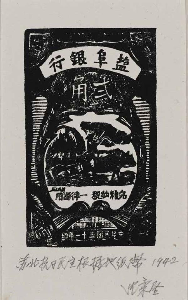 展开现场展出了沈柔坚在1942年创作的抗币,沈柔坚在《以木刻画作抗币琐记》中写到,“1942年春,盐阜区根据地开始建立盐阜银行时,需要发行货币,但苦于无制版条件。当时银行行长骆耕漠同志托里程同志带了封信到盐阜报社找我,问我是否能用木刻图案形式刻制钞票,以便上机直接印刷。我说试试看,可用黄杨木。接此任务后,我便着手按大小票面设计画稿。经研究选定一横一直各一种。骆耕漠同志看到后高兴地说,真想不到木刻画也可以做钞票,用木刻画印钞票,风格刀法不同,别人很难假冒。我说,我只会刻画不会刻字,用木刻刀刻字真费劲,‘1942年’的‘9’字刻反了怎么办?重刻如何?银行同志说,不要紧,这样更假不了。我自己只保存拓印的一些原稿,原版便交给了银行。不久钞票正式印出并发行,我记得是用牛皮纸印成深蓝色的,上面还盖了银行和行长的两方朱红色的小图章,人们为自己的人民政府首次发行货币而喜悦,我看到木刻画艺术在革命根据地能在各方面发行,感到格外高兴。”