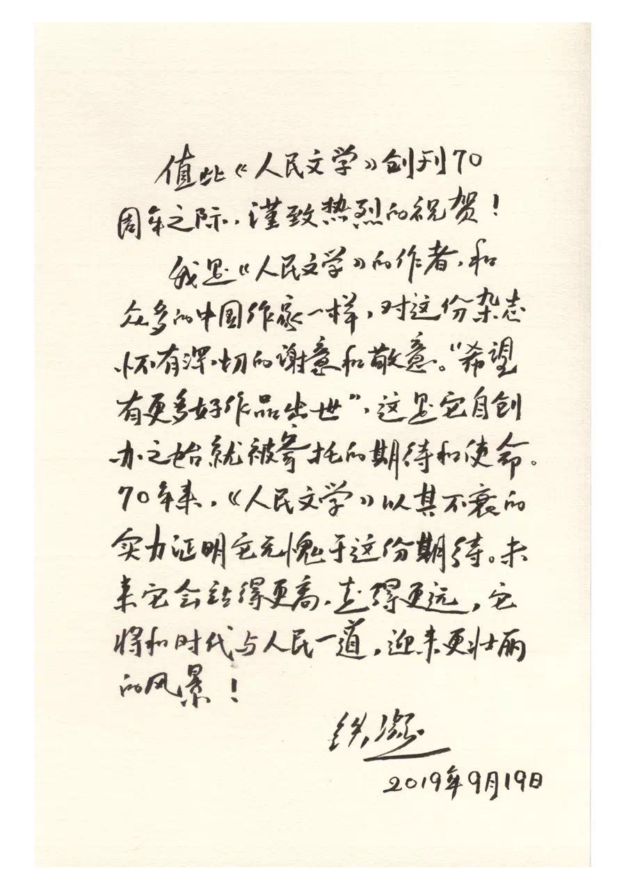 值此《人民文学》创刊70周年之际,谨致热烈的祝贺!