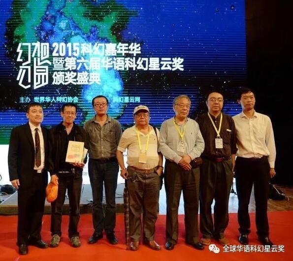 时任世界华人科幻协会会长 吴岩(左一),副会长 韩松、刘慈欣、王晋康、何夕,常务副会长兼秘书长姚海军,监事长董仁威(中)于2015年六届星云奖成都嘉年华