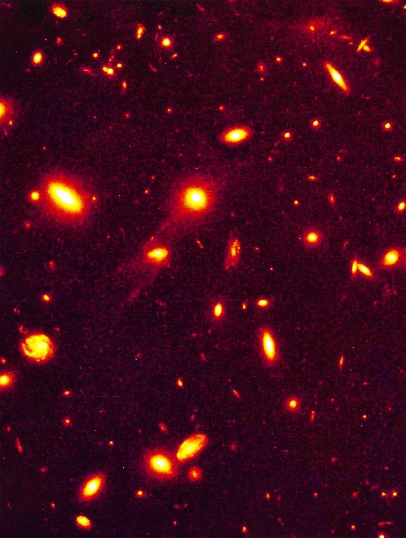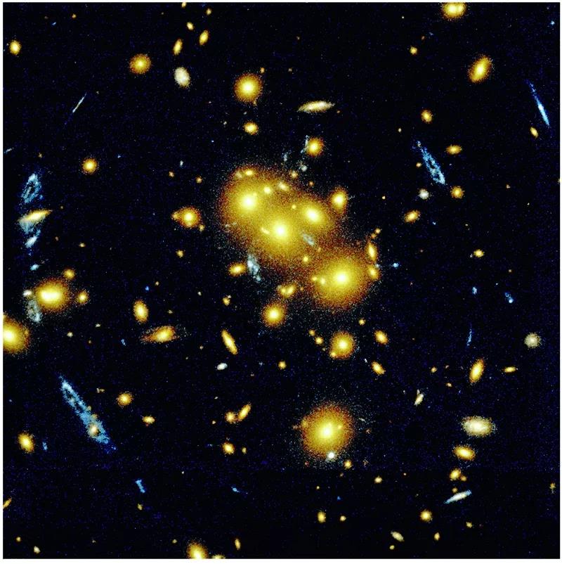 遥远星系的多重成像看上去像暗弱的蓝色椭圆,这是引力透镜效应导致的。当远处物体发出的光被干扰物体的引力场偏折时,这种效应就会出现。在这张图里,红色星系团聚集在中间,使位于它们后方更远处的星系的像扭曲了。这张图片由哈勃望远镜提供。