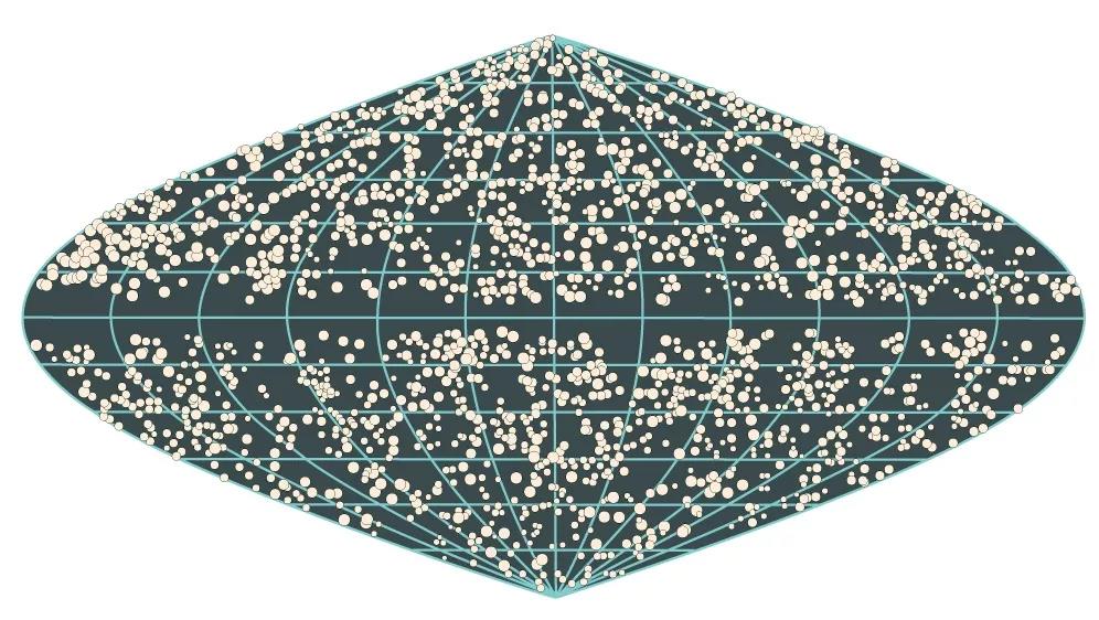 在这幅包含了从3亿~10亿光年远的天体的图中,可以明显看出星系是均匀分布的。唯一不均匀的地方是靠近中线的间隙,那是因为天空的这个区域被银河挡住了。这张图片由普林斯顿大学的迈克尔·施特劳斯(Michael Strauss)依据红外天文卫星的数据制作。