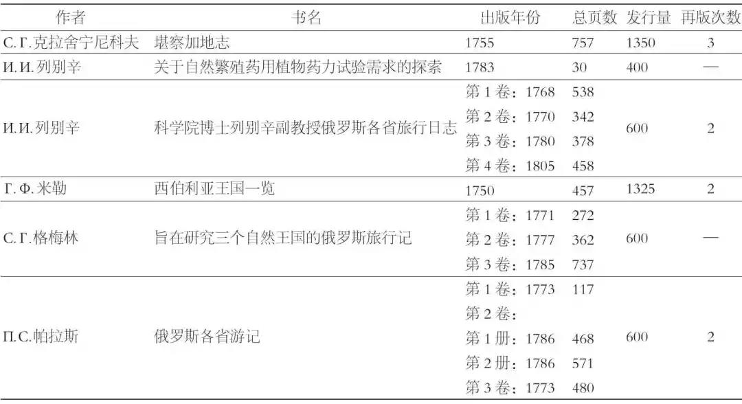 1724年,彼得一世提倡创建了圣彼得堡科学院。根据彼得大帝的意图,科学院不仅仅要“生产”科学,也要将其“传播”,在这些“科学”当中包括自然科学(凤凰彩票主要指环境科学)。在政府的资金支持下,俄罗斯学者们进行了大量的田野调查,对具有生态学特色的俄罗斯植物群和动物群进行了描写、研究和系统化。田野调查的成果便是科学院教授们的诸多学术著作,如С.П.克拉舍宁尼科夫(С.П.Крашенинников)的《堪察加地志》、И.И.列别辛(И.И.Лепехин)的《科学院博士列别辛副教授俄罗斯国家各省旅行日志》和《关于自然繁殖药用植物药力试验需求的探索》、П.С.帕拉斯(П.С.Паллас)的《 俄罗斯各省游记》、Г.Ф.米勒(Г.Ф.Миллер)的《西伯利亚王国一览》以及医学博士С.Г.格梅林(С.Г.Гмелин)《旨在研究三个自然王国的俄罗斯旅行记》,这些成果均在圣彼得堡科学院印刷厂印刷出版。表4 为18世纪俄罗斯学者在科学院印刷厂出版的学术著作相关数据。