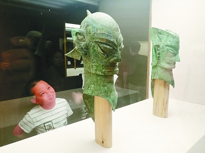 一位小观众对国家博物馆“古蜀华章展”中的青铜头像产生了兴趣。本报记者李韵摄/光明图片