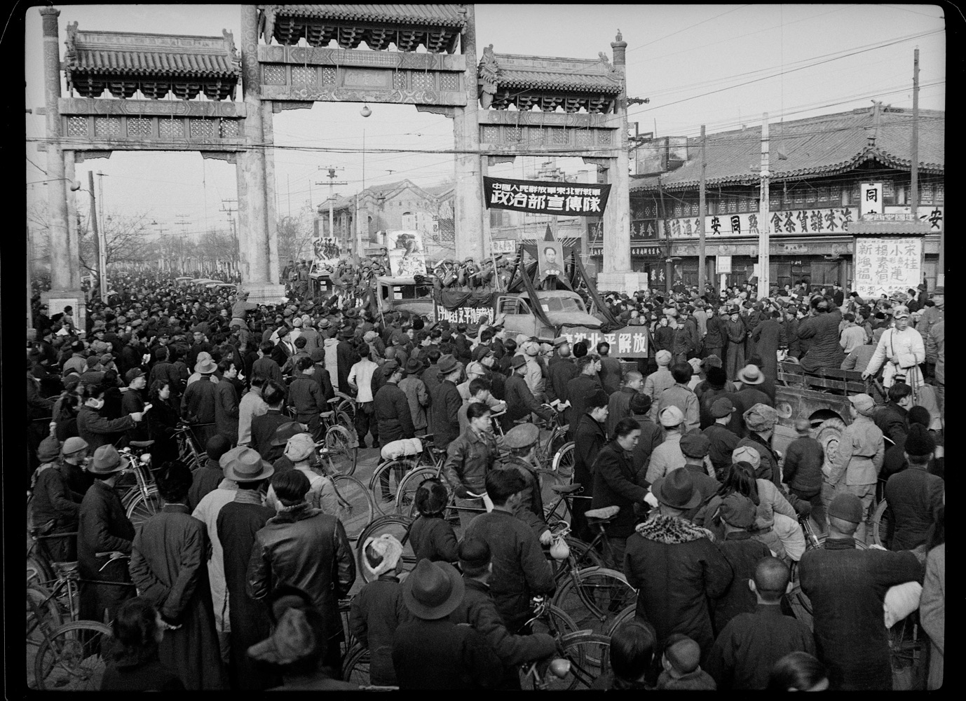 北平入城式,解放军宣传队的军车经过西四牌楼。1949年2月3日,北京