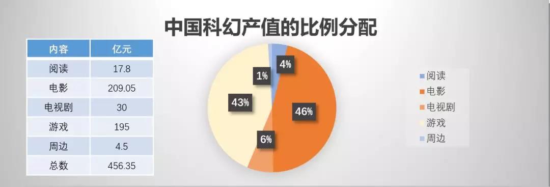 在政府的产业支持拉动之下,产业分布正在趋于丰富和完整。除了前面提到的阅读、影视、游戏、周边产品以外,科幻主题游乐园、科幻会展、科幻演艺等也在逐渐发展,但暂时还没有可靠数据能够使用。相信在未来的几年有更多新的产业形式会加入其中。