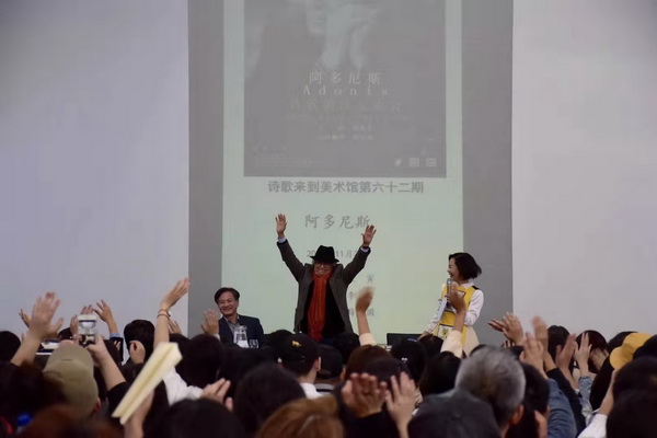 11月3日,阿多尼斯的诗篇在上海民生现代美术馆响起。上海民生现代美术馆举办的“诗歌来到美术馆”第六十二期“阿多尼斯朗读交流会”,邀请到了在世界诗坛享有盛誉的诗人阿多尼斯,500多名诗歌爱好者从全国各地赶来,与阿多尼斯轮交流诗歌与生活的奥义。八十九岁高龄的阿多尼斯依然十分健谈,灵动又幽默,他对人生的思考解读令在场观众或释怀一笑或拍手称赞。朗读会上,阿多尼斯还与读者们轮流朗诵着他的新作《桂花》。