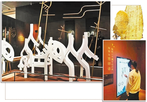 左图 人骑马甲骨文展示。 右图 展览现场,观众可以自己制作甲骨文祝福卡片。 佘 颖摄