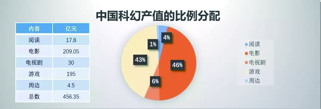 2018年中国科幻产业发展高速增长,总产值为456.35亿元。2019年上半年总产值为315.64亿元。科幻阅读平稳增长,科幻电子游戏异军突起,周边产品暂露头角,具有引领作用的科幻影视在最近两年已经改变了过去国外影片独占鳌头的局面,国产科幻影视作品取得了不凡的成绩,正在逐渐演变成产业龙头。