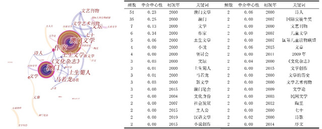 基于数据分析,“土生文学”、“土生葡人”是二十年澳门文学研究的高频词,《澳门文学源流与涵义之辨析》(张剑桦:《广西师范大学学报(哲学社会科学版)》2009年第6期)中将澳门文学界定为一种“植入式文学”,认为其缺乏“根生性文学”元素。上述关键词的出现论证了澳门的历史性、地域性与跨文化性,其高频次则证实了地域文化与文学书写的关系成为澳门文学的基本的研究视角。“诗歌”、“诗人”及“小说”、“小说创作”提示着澳门文学的主流研究领域,尤其是诗歌,高中心度的数据揭示了诗歌在澳门文学体系中的主体地位。高频词“文艺刊物”、“文学艺术刊物”、“文化杂志”佐证了澳门文学副刊化现状。澳门诗歌、散文的发表与传播依赖文学杂志及文学副刊,因而媒介研究可成为澳门文化生态研究的另一个视角。“新文学”和“汉语文学”两个关键词反映出澳门文学已被纳入“汉语新文学”研究视阈,《澳门文学与汉语文学的后现代感兴》(朱寿桐:《社会科学辑刊》2019年第3期)与《澳门文学与汉语新文学的理论启示》(朱寿桐《南方文坛》2019年第4期)阐述了澳门经验对于汉语新文学领域的独特贡献。