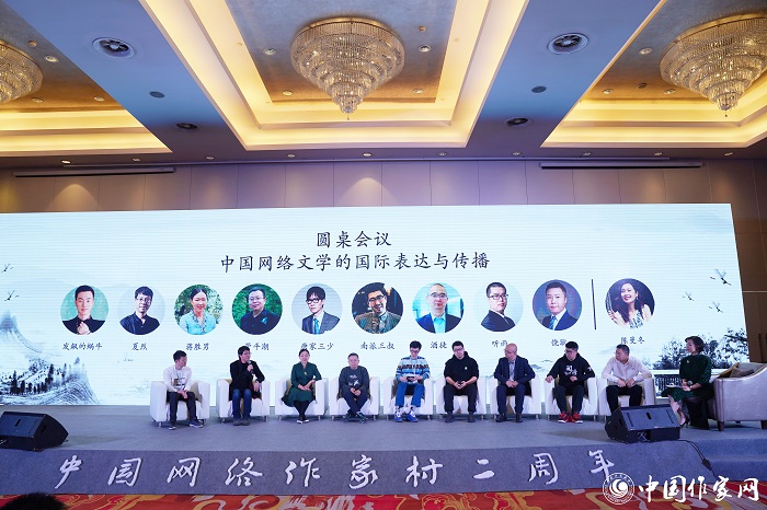 开幕式后,网络作家唐家三少、管平潮、发飙的蜗牛、蒋胜男、南派三叔、酒徒,学者夏烈和咪咕数媒总编辑听雨、橙瓜网首席执行官饶耿等以“中国网络文学的国际表达与传播”为议题展开讨论。