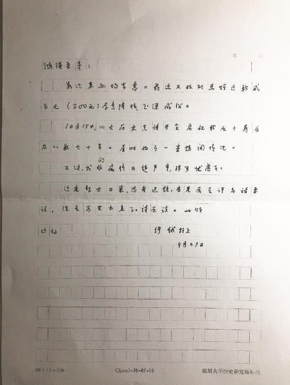 1992 年9月27日缪钺致钱鸿瑛函复印件