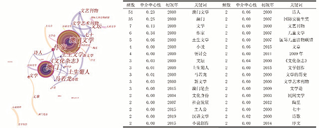 基于数据分析,“土生文学”、“土生葡人”是20年澳门文学研究的高频词,《澳门文学源流与涵义之辨析》(张剑桦:《广西师范大学学报(哲学社会科学版)》2009年第6期)中将澳门文学界定为一种“植入式文学”,认为其缺乏“根生性文学”元素。上述关键词的出现论证了澳门的历史性、地域性与跨文化性,其高频次则证实了地域文化与文学书写的关系成为澳门文学基本的研究视角。“诗歌”、“诗人”及“小说”、“小说创作”提示着澳门文学的主流研究领域,尤其是诗歌,高中心度的数据揭示了诗歌在澳门文学体系中的主体地位。高频词“文艺刊物”、“文学艺术刊物”、“文化杂志”佐证了澳门文学副刊化现状。澳门诗歌、散文的发表与传播依赖文学杂志及文学副刊,因而媒介研究可成为澳门文化生态研究的另一个视角。“新文学”和“汉语文学”两个关键词反映出澳门文学已被纳入“汉语新文学”研究视阈,《澳门文学与汉语文学的后现代感兴》(朱寿桐:《社会科学辑刊》2019年第3期)与《澳门文学与汉语新文学的理论启示》(朱寿桐《南方文坛》2019年第4期)阐述了澳门经验对于汉语新文学领域的独特贡献。