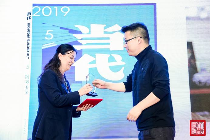 人民文学出版社副社长王秋玲(左)为李修文(右)颁奖