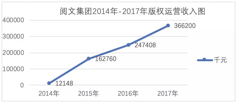 另外以阅文集团为例,全版权运营收入目前已经成为其第二大收入来源。阅文集团2014年到2017年的版权运营收入呈现一个总体持续增长的趋势,在2015年合并盛大文学之后,版权运营年收入从1214万元增长到1.63亿元,到2017年,达到3.66亿元,出现了飞跃式增长。