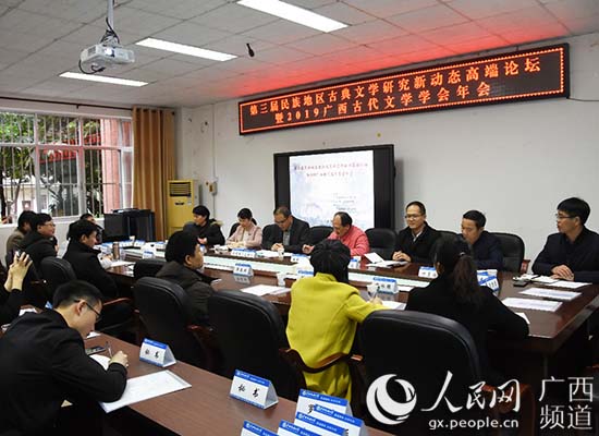 人民网南宁12月31日电 2019年12月21日,由广西古代文学学会、广西民族大学国学院主办,广西民族大学文学院协办的“第三届民族地区古典文学研究新动态高端论坛暨2019广西古代文学学会年会”在广西民族大学逸夫实验楼举行,来自广西大学、广西民族大学、南宁师范大学等区内十余所高校、科研机构的四十余名代表参加会议。