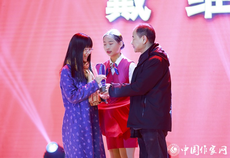 诗人王家新(右)为提名奖获得者戴潍娜颁发奖杯,由安琪(左)代为领取