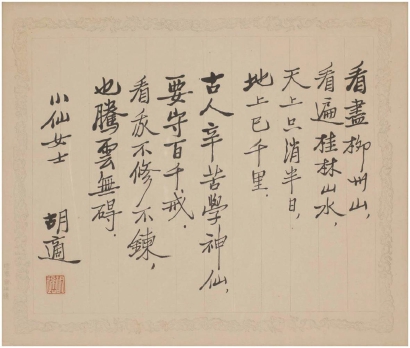 胡适书赠余小仙女士“飞行小赞”