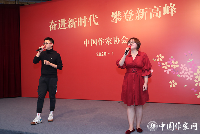 中国现代文学馆多功能厅张灯结彩,温暖如春。舞台上的红色布景和“奋进新时代攀登新高峰”大字分外醒目,传递着喜庆祥和的节日气氛。