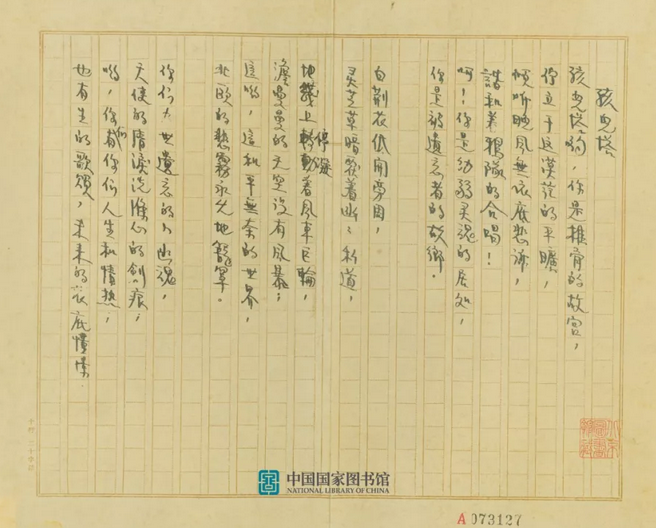 殷夫的著译手稿,留存于世的仅《孩儿塔》一种,现藏于国家图书馆名家手稿文库。诗稿共117页,装订为四册。稿件署名白莽,所收作品最早写于1924年,最迟写于1929年秋,卷首有1930年写成的《〈孩儿塔〉上剥蚀的题记》。