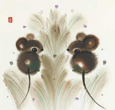 在他笔下,花丛里、绿荫下,一窝窝、一簇簇生肖鼠,蹦跳着、斜躺着、依偎着,胡子翘着,小尾巴滴溜溜乱转,个个眉飞色舞,心满意足。韩美林曾一口气画了700多幅可供选择的稿样。