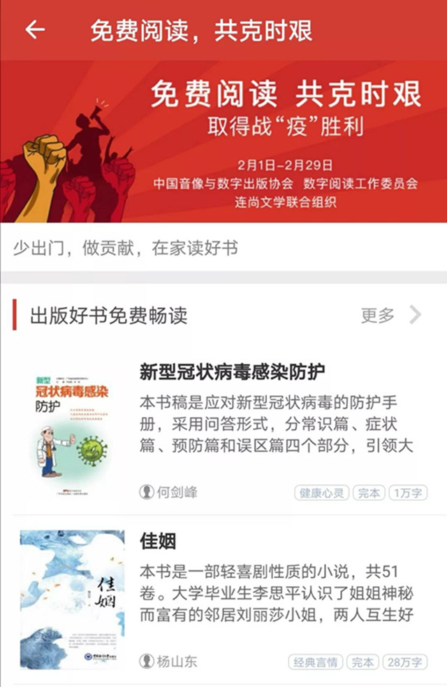 随着《数字阅读行业战“疫”倡议书》的发布,连尚文学上线“免费阅读,共克时艰,取得战‘疫’胜利”专栏,精选数百部优秀网络文学小说、传统经典文学作品、病毒防护电子书等供读者免费阅读,用阅读传递信心,用知识做好防护,期待共同书写战“疫” 的胜利篇章。
