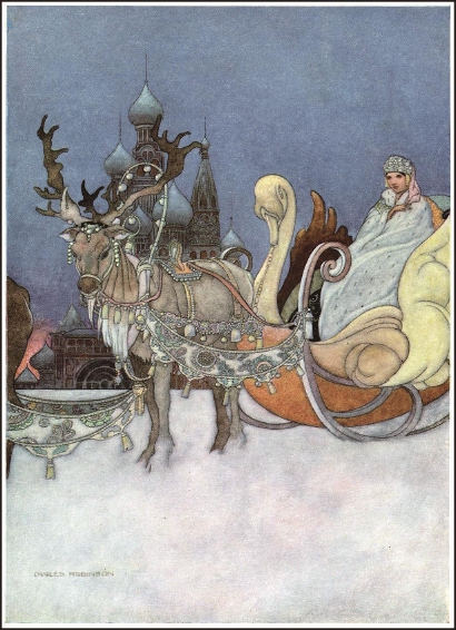 以前介绍过查尔斯·罗宾逊为莎士比亚十四行诗所作的插图。伦敦的达克华斯出版公司,在二十世纪上半叶以善于发掘优秀的文学作品而蜚声英美。1913年,他们聘请罗宾逊为一部限量发行的王尔德童话集创作了一整套插图,初版只出售两百五十部,不过后来曾多次重印。这幅彩色插图,将故事的开头描摹得惟妙惟肖:公主坐着六匹驯鹿拉的雪橇从芬兰来出嫁:“雪橇的形状像一只金色的大天鹅。小公主本人就坐在天鹅的两只翅膀中间。她那件白鼬皮的长披风覆盖到她的脚下,头上戴了一顶银色织物做的小帽子,脸色苍白得就像她向来所居住着的雪宫的颜色。”