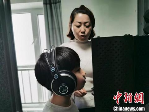 河北省邢台市育才小学的王小蹦和妈妈一起录制“抗疫新儿歌”《病毒走开》。中国儿童中心供图